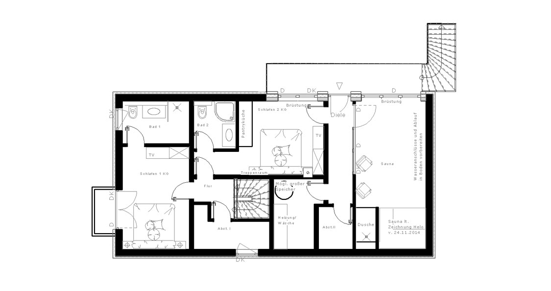 Es besteht die Möglichkeit bei Verfügbarkeit ein weiteres, viertes Schlafzimmer mit Doppelbett (2 Matratzen) für 2 Personen im Souterrain der Nebenhaushälfte hinzu zu mieten. So besteht die Möglichkeit für eine größere Familie die Haushälfte NARWAL auf bis zu 8 Personen auszuweiten. Das vierte Schlafzimmer ist durch den Garten über einen Außenzugang zu erreichen und verfügt ebenfalls über ein eigenes Duschbad und WC, einen Fernseher sowie eine kleine Kochnische inkl. Kühlschrank.